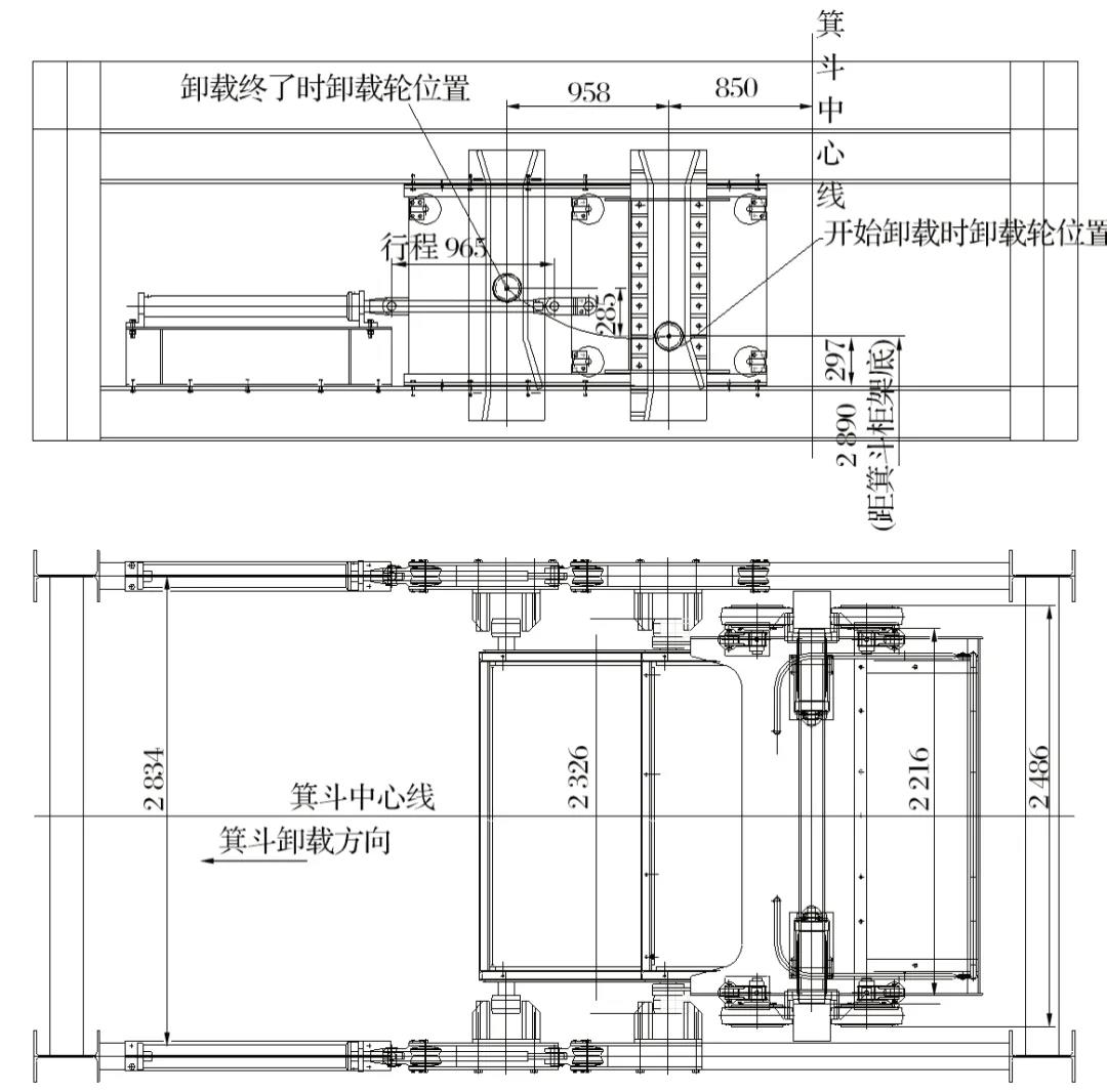 (2)這種2個卸礦點應用在同一箕斗的卸礦方式在我國尚屬首次,會澤礦3號豎井是目前唯一在用的雙卸載點礦井。一般的礦井一個井筒采用一個卸礦點,多個水平的多點卸礦一般要打多個井筒。為了多點卸礦功能的順利實現(xiàn),移動直軌到位精度偏差不能超過±5 mm,并且應滿足鋼絲繩正常的彈性變形伸縮量的卸載要求。多點卸礦為礦山開采節(jié)約了大量成本,移動直軌卸載裝置如圖2所示。